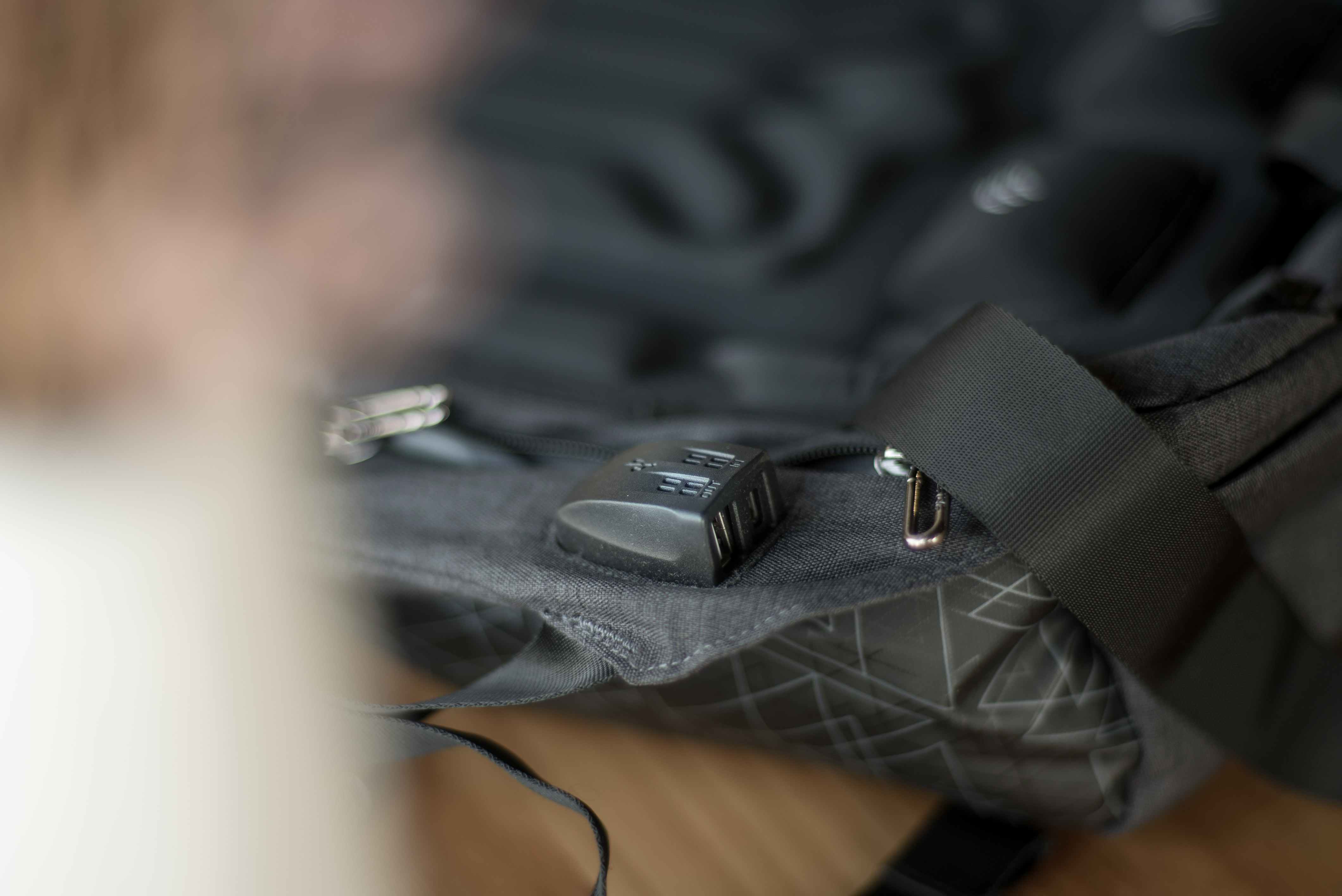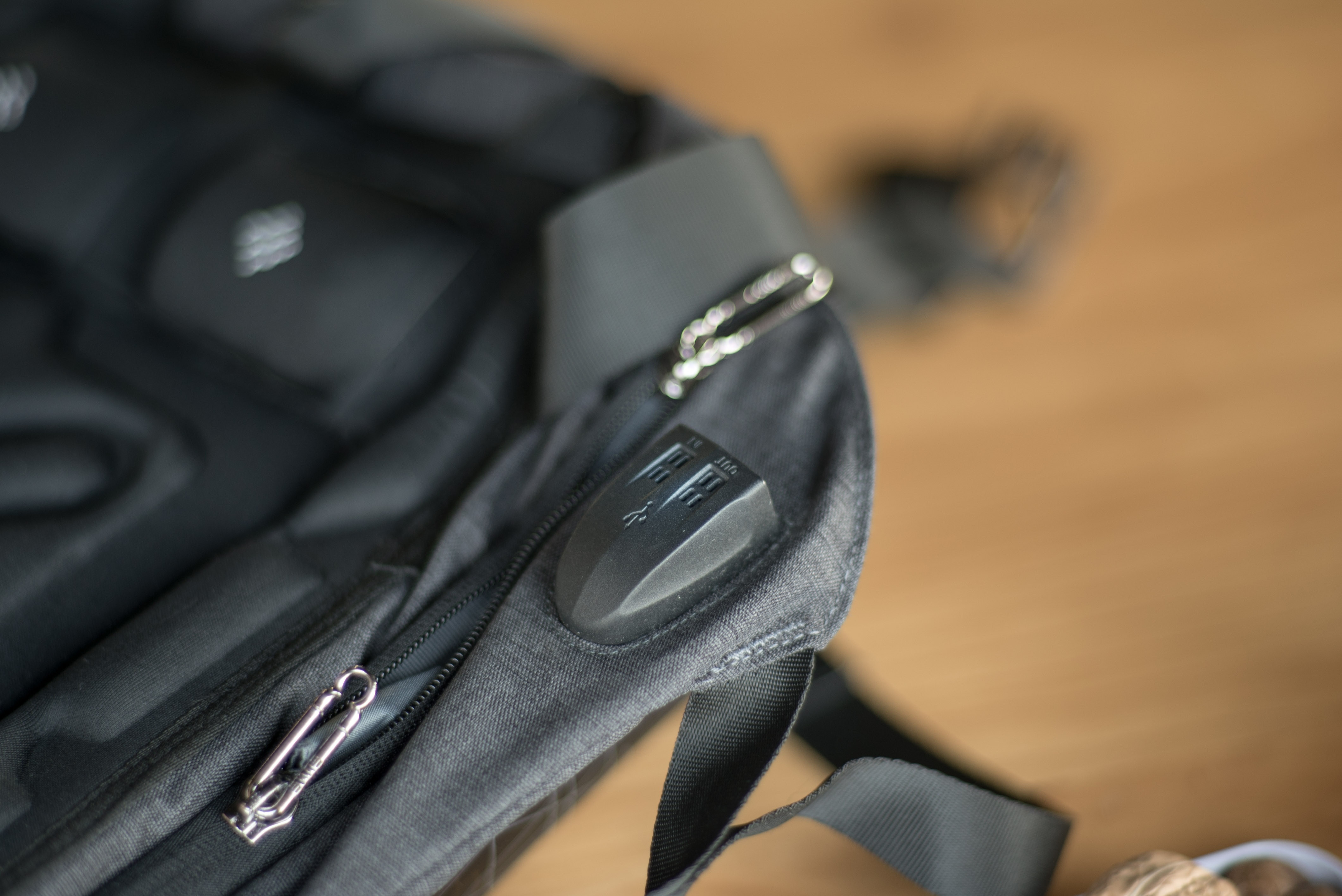 ‘The exterior of the bag has some clever features, especially the USB outlet connected to the power bank inside of the bag. On the lower end of the shoulder strap, there are two USB portals you can charge your phone with. So if your phone is running low on battery on a long commute, you can use and charge it at the same time. The zipper shows good quality and has the anti-theft feature. Other than the main slot, you will find an additional accessible slot on the front of the bag if you need to reach something quick.